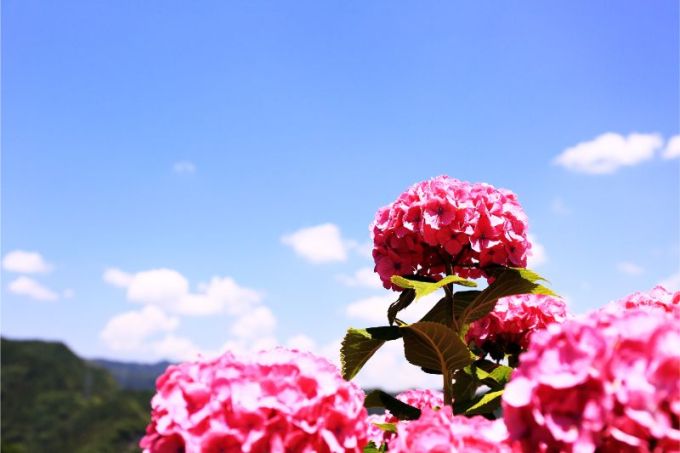 赤系のあじさいは青空とよく合います。